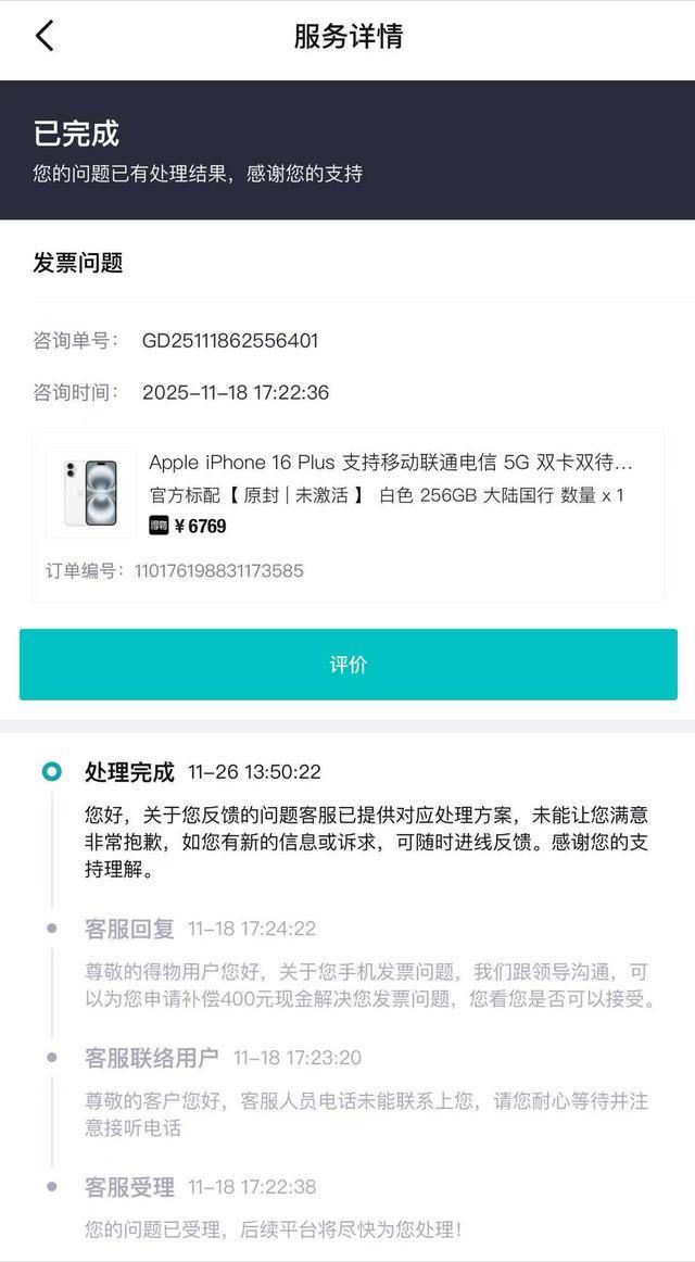 2025年6月30日,楚先生在得物App上选购了一部价值6769元的iPhone 16Plus手机。“手机标注全新未激活、未拆封,平台回收了我的旧手机iPhone13,折算后我实际支付了4834元。”楚先生表示,下单后收到手机,但包裹中未附带发票。他第一时间联系得物,提出索要购物发票的诉求。