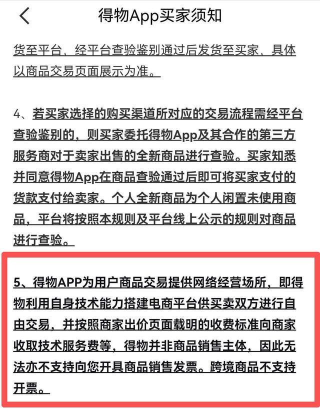 2月5日,华商报大风新闻联系得物App相关工作人员,对方答复称,平台上的商品主要分为两类:一类是品牌直发,该类商品可正常开具发票;另一类是个人卖家销售的商品,由于个人卖家未注册工商营业执照,通常无法提供发票,这一规则已在App的买家须知中明确告知。