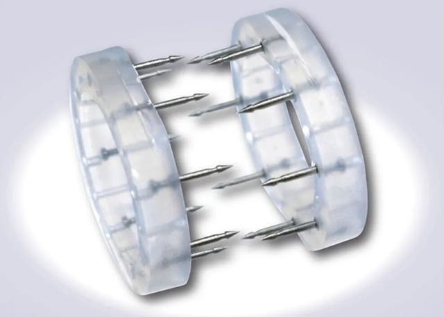 公开资料显示,该微血管吻合装置是一款由国内医疗公司代理的进口医疗器械。产品由两个超高分子量聚乙烯圆形环组成,上面带有不锈钢针。吻合血管时,将断开的血管勾在带有不锈钢针的圆环上,使用钳夹将圆环闭合,可缩短手术时间,利于术后恢复。