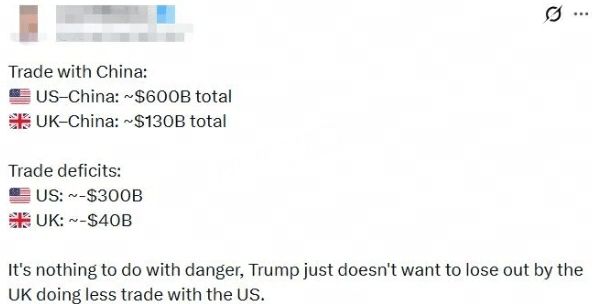 有网友直言,“这根本跟风险没有关系,特朗普只是不想因为英国减少与美国的贸易而蒙受损失。”