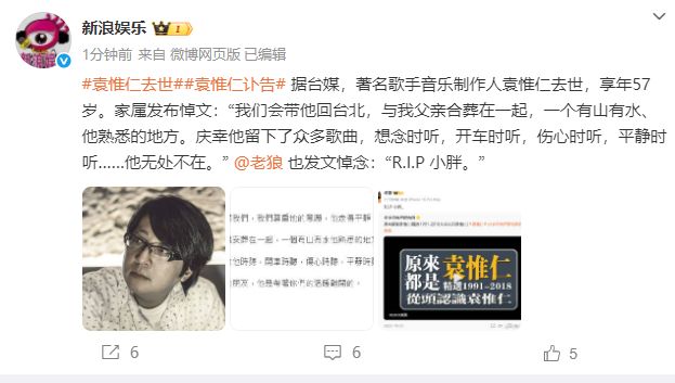 据新浪娱乐,著名歌手音乐制作人袁惟仁去世,享年57岁。
