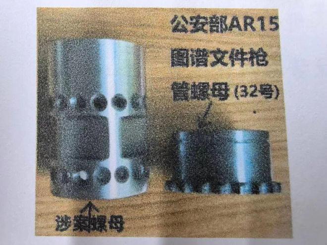 但通过图片对比,马晓强生产的“铁头子”与公安部AR-15图谱文件枪管螺母(32号)的高度、外形均不相同。