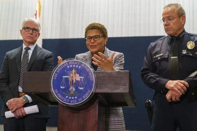 2023年12月2日,在美国加利福尼亚州洛杉矶市,洛杉矶市长凯伦·巴斯(中)在发布会上发言。当时,洛杉矶市发生街头连环凶杀案,3名无家可归者遭枪杀。美国政府统计数据显示,美国2022年1月时有超过58万无家可归者,其中洛杉矶和纽约是无家可归者最多的城市。美国住房和城市发展部2024年发布的年度报告显示,美国无家可归者人数达到77.18万,即每1万人中约有23人无家可归,比2023年同期增加18.1%,这是自2007年开始此项统计以来的最大增幅 图:新华社/美联