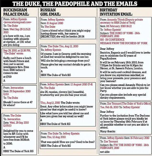 另一封邮件显示,安德鲁王子曾邀请他前往白金汉宫共进晚餐,并表示可以提供“充足的隐私”。目前尚不清楚这次晚宴是否实际举行。