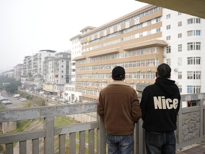 1月27日,黄平和父亲黄明站在沱江一桥上,遥望吴小萍尸骨被发现的商城天台 / 记者周子扬 摄