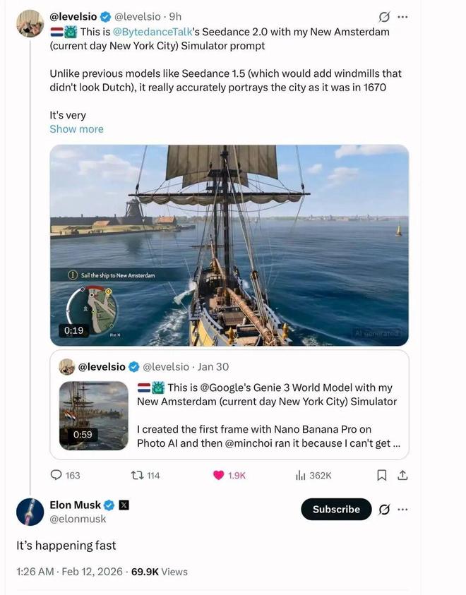 就连全球首富马斯克也在转发某个网友有关Seedance的评论时,感慨模型发展速度快(It's happening fast)。