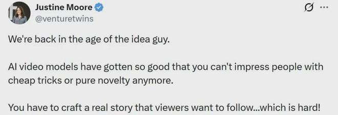 “我们终于回到了拼创意的时代。AI视频模型已经强大到,靠廉价特效和单纯猎奇再也打动不了人了。你必须讲好一个真正让人愿意追随的故事——而这,恰恰是最难也最珍贵的事。”
