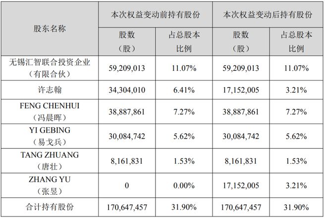 本次权益变动后,许志翰直接持有公司无限售条件流通股份1715万股,占公司总股本的3.21%。张昱无条件且不可撤销地将其持有的公司股份对应的全部表决权、提名和提案权、参会权、监督建议权以及除收益权和股份转让权等财产性权利之外的其他权利全权委托给许志翰行使。