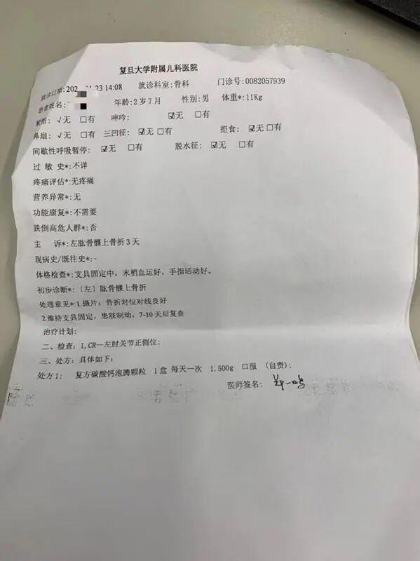 孩子回家后,王女士发现其左胳膊肿胀变形,意识到情况严重,当即驱车送往复旦大学附属儿科医院检查。经过一系列检查,当天晚上确诊为左胳膊肘关节错位骨折,医生立刻给孩子上了支架固定。