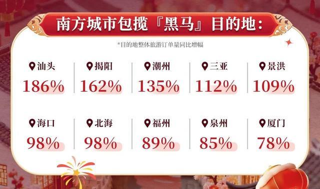 2026年春节假期较往年更长,南下避寒也成为越来越多家庭的共识,旅游人群出现了明显的分流。携程发布的《2026马年春节旅游市场预测》显示,汕头、揭阳、潮州等南方城市春节预订量同比涨幅均超过100%,泉州、福州、厦门等福建城市的预订涨幅也在八至九成左右。