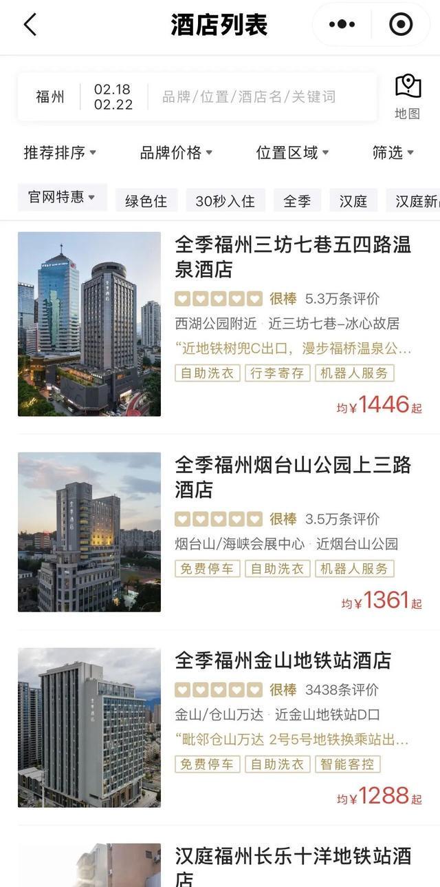在北京工作的高园计划春节带父母去福州旅行。她在1月底订房时发现,初二到初六期间,福州市区几乎所有连锁酒店都在千元以上,“便宜一点的要么位置偏,要么没房,亚朵、全季、桔子水晶之类好一点的位置很多订不到”。