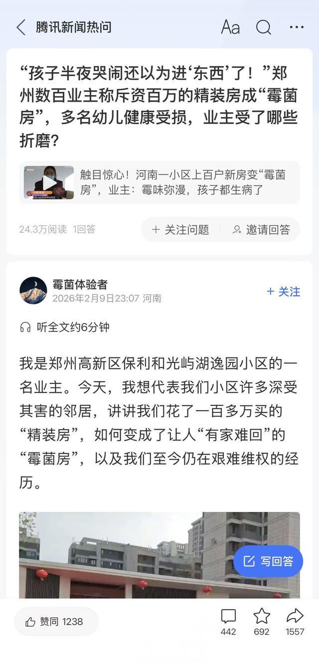 郑州数百名业主称购买的精装房变"霉菌房" 官方回应示意图
