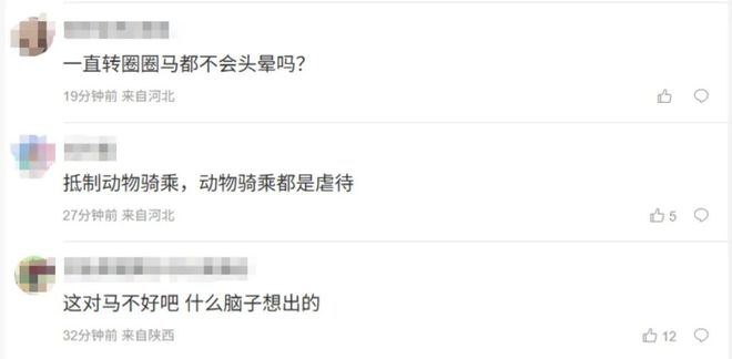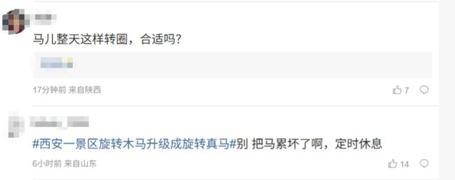 2月10日,有媒体报道“西安一景区旋转木马升级成旋转真马”,引发网友关注。因该项目的几匹真马被固定,围着一处轴心反复转圈,有网友质疑“虐待动物”“对马不好”。