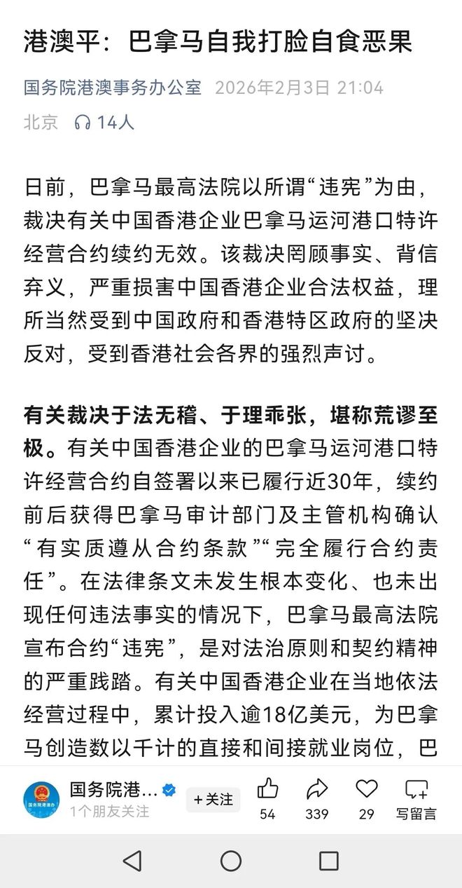 港澳办文章则指出,巴拿马此举,“自毁国家信用,将对该国营商环境和经济发展造成深远损害,并严重破坏国际贸易规则”。