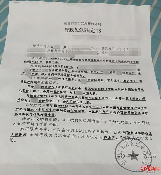 王女士出示的行政处罚决定书显示:2025年12月10日13时许,古某与妻子王女士发生家庭纠纷,后冲突加剧。期间,古某对王女士进行殴打,致王女士受伤,经人体损伤程度鉴定为轻微伤。因古某的违法行为有较严重的后果,根据修订前的《中华人民共和国治安管理处罚法》第二十条第一项之规定,对古某从重处罚。根据修订前的《中华人民共和国治安管理处罚法》第四十三条第一款之规定,决定对古某行政拘留10日,并处罚款500元。该决定书出具日期为2026年1月7日。