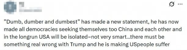 还有美国网友哀叹道,“‘无脑、更无脑、最无脑’的家伙又出惊人言论了。他正让所有国家纷纷转向中国、彼此抱团,长远来看美国只会陷入孤立,这实在太不明智了……特朗普的脑子肯定出了大问题,而他的所作所为,正让美国民众跟着遭殃。”