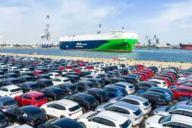 汽车运输船在山东港口烟台港装运将要出口的国产汽车 资料图