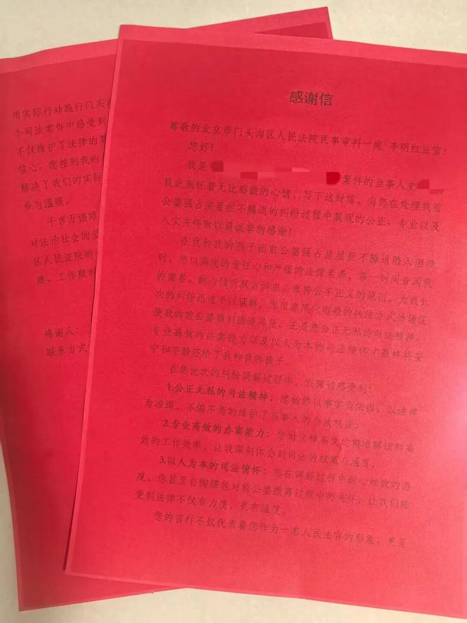 不久后,一面写着“铭心不忘法理人情 鼎力誓卫正义道德”的锦旗与一封感谢信送至法院。史女士激动地对李明红法官与凌志颖助理说:“你们是我人生至暗时刻的一道光。”