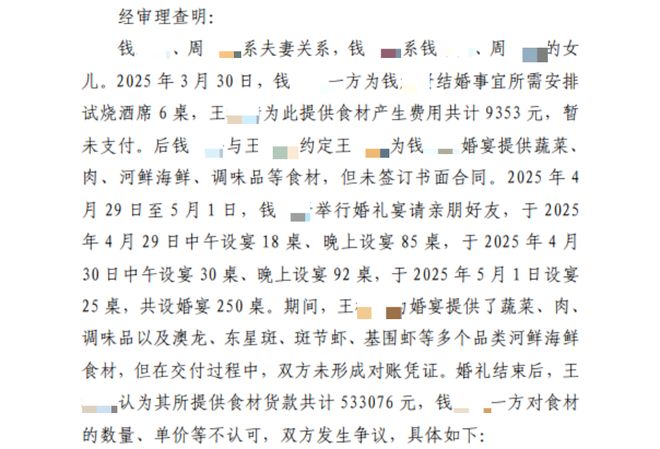 根据判决书,王老板要求钱老板一方支付海鲜、猪肉、蔬菜等食材费用一共534565元。钱老板一方认为,婚礼当天,王老板从未向该指定人员交货,也没有人验收,王老板确实为婚宴提供了部分食材,可费用已经无法核算,综合考虑应该费用在300000元以下,其愿意认可的金额为270000元。