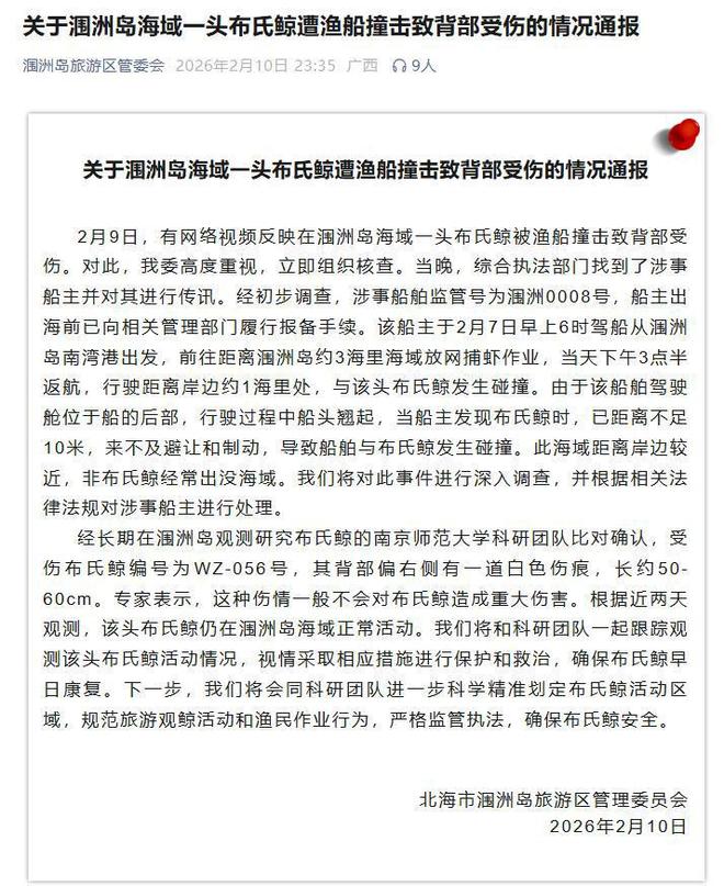 2月10日晚,北海市涠洲岛旅游区管理委员会发布情况通报称,经初步调查,涉事船舶监管号为涠洲0008号,船主出海前已向相关管理部门履行报备手续。该船主于2月7日早上6时驾船从涠洲岛南湾港出发,前往距离涠洲岛约3海里海域放网捕虾作业,当天下午3点半返航,行驶距离岸边约1海里处,与该头布氏鲸发生碰撞。由于该船舶驾驶舱位于船的后部,行驶过程中船头翘起,当船主发现布氏鲸时,已距离不足10米,来不及避让和制动,导致船舶与布氏鲸发生碰撞。此海域距离岸边较近,非布氏鲸经常出没海域。我们将对此事件进行深入调查,并根据相关法律法规对涉事船主进行处理。
