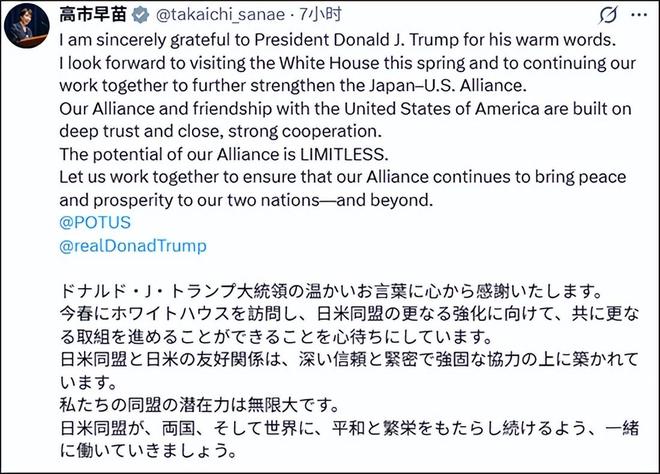 高市早苗深夜在社交平台上用日、英双语发文感谢特朗普