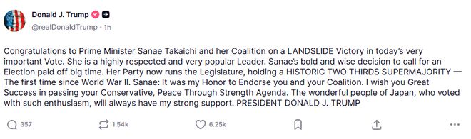 高市早苗深夜在社交平台上用日、英双语发文感谢特朗普