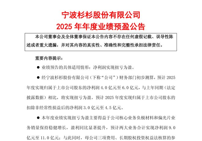 1月31日,浙股杉杉股份发布业绩预告,预计2025年度实现净利4.0亿元至6.0亿元,与上年同比将实现扭亏为盈;扣除非经常性损益后预计实现净利3.0亿元至4.5亿元。