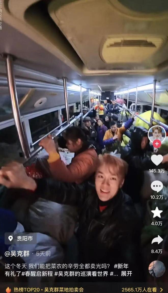 这些画面,是台湾歌手吴克群,在贵阳252路公交惠农专线上拍到的。这也是他短视频账号中,最新的一期节目。满车的菜农、满车的蔬菜。
