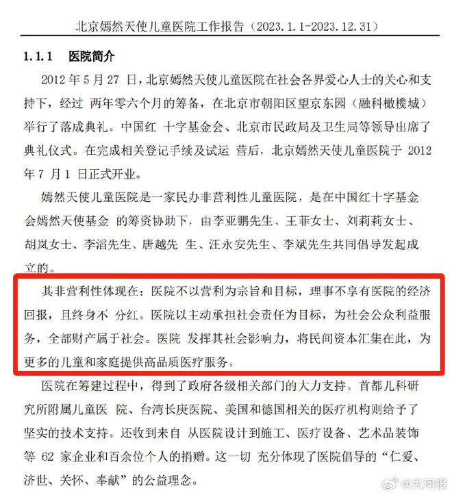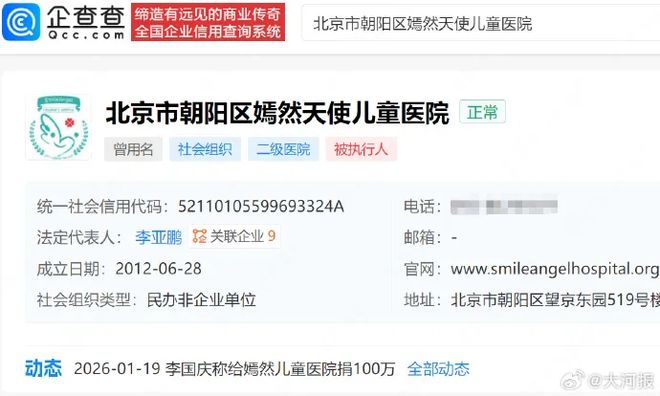 据企查查平台显示,嫣然天使儿童医院法定代表人李亚鹏,注册资金1000万元,是一家民办非企业单位。往年工作报告显示,该院理事会由李亚鹏等5名理事、1名监事组成,理事不享有医院的经济回报,且终身不分红。