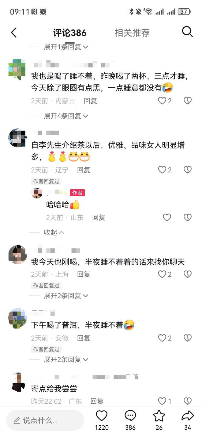 这些天,在社交平台,不少网友晒出自己在李亚鹏直播间抢到的茶叶。“喝了李亚鹏的茶,凌晨两点都睡不着,支持鹏哥,起来接着喝。”河南一位网友称,本来不喝茶,为了支持李亚鹏抢了盒茶叶,晚饭后泡了喝,一直睡不着。网友在评论区称“哈哈哈,原来不止我一个”。