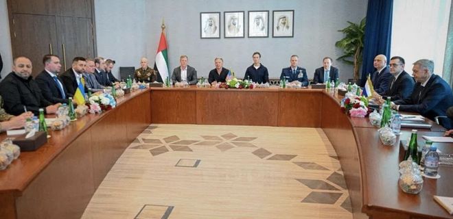 ▲乌克兰(左)、美国(中)、俄罗斯(右)代表团在阿布扎比举行三方会谈